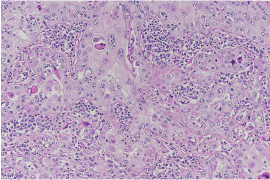 Gatto Maschio intero 13 anni. Cute orecchio. Carcinoma a cellule squamose (Ematossilina-Eosina x20).