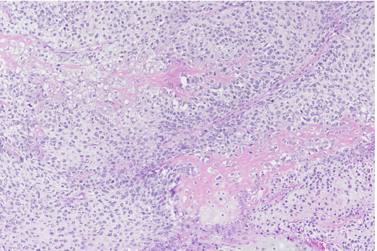 Cane Femmina intera 10,2 anni. Mammella. Osteosarcoma osteoblastico produttivo extrascheletrico (Ematossilina-Eosina x10).