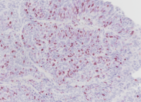 Cane Femmina intera 9,6 anni. Carcinoma solido della mammella. Immunoistochimica - Ki67 (x20). |