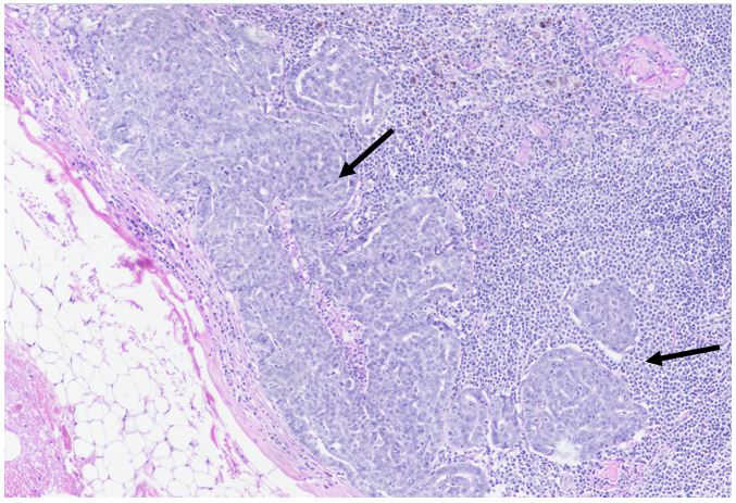 Cane Femmina intera 10,5 anni. Linfonodo. Metastasi di carcinoma semplice della mammella (frecce) (Ematossilina-Eosina x 10). |