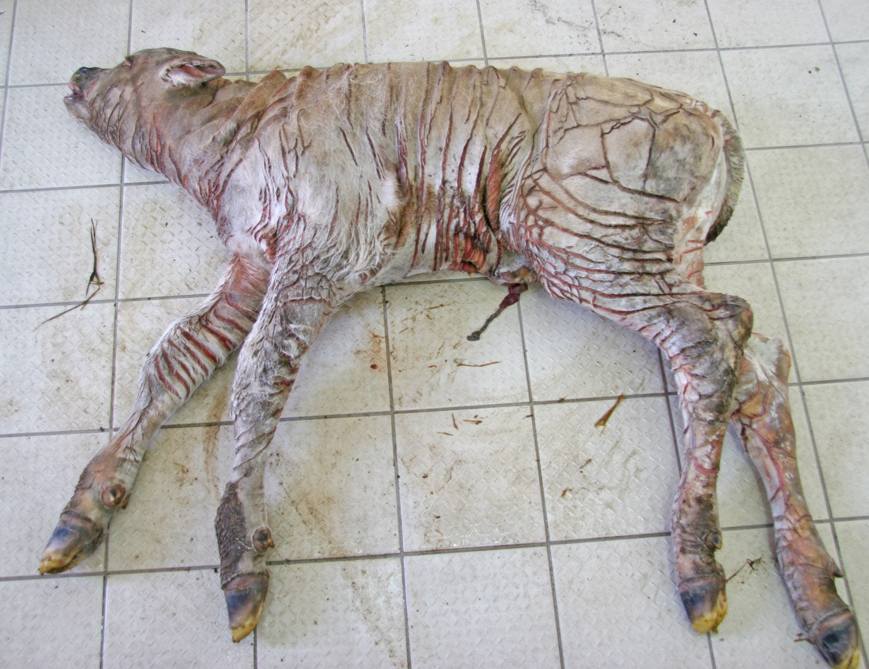 L’Ittiosi fetale (feto arlecchino) è una rara malattia della cute (genodermatosi congenita grave), descritta in diverse specie, non compatibile con la vita, per la quale i vitelli ammalati nascono morti o muoiono pochi giorni dopo la nascita. La cute è ricoperta di grandi placche cornee separate da profonde fessure e somiglianti ad una “corazza di cuoio”, il pelo solitamente è completamente assente. La cute è spessa ed anelastica, con eversioni delle giunzioni muscolo cutanee (eclabium ed entropion). Questa malattia è molto simile all’ittiosi arlecchino umana (HI), condizione incompatibile con la vita, dove sono presenti formazioni simili a squame diffuse su tutto il corpo. La malattia è causata da una mutazione “non senso” del gene ABCA12 (posizione 1935) che codifica per una Arginina al posto di una Istidina (Charlier et al., 2008).