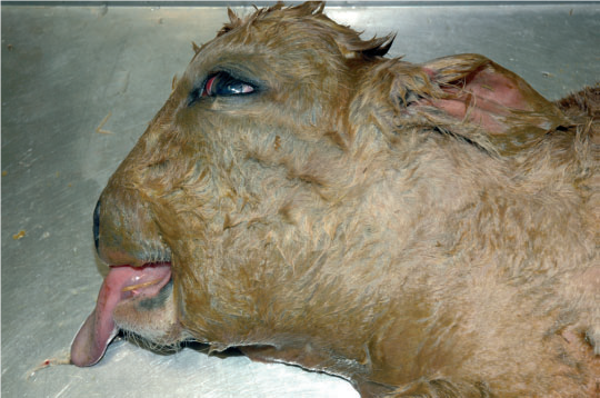 Splancnocranio accorciato e appiattito, protrusione della lingua in un vitello pancione (Testoni S. et. al. Congenital facial deformities, ascites and hepatic fibrosis in Romagnola calves. Vet Rec. 2009 May 30;164(22):693-4)