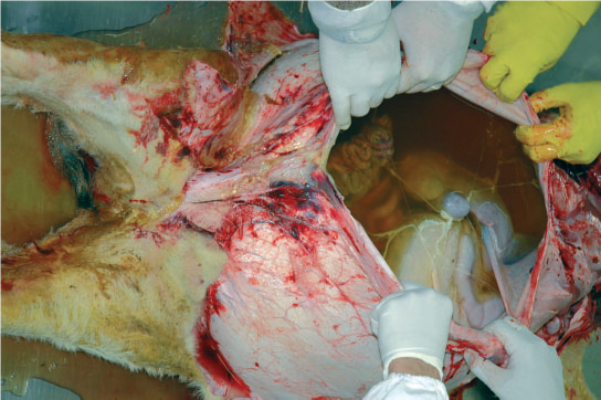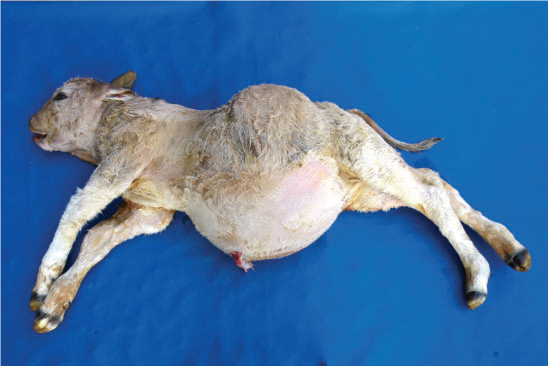 Accumulo di liquido torbido, giallo-scuro, nella cavità addominale di un vitello pancione (Testoni S. et. al. Congenital facial deformities, ascites and hepatic fibrosis in Romagnola calves. Vet Rec. 2009 May 30;164(22):693-4)