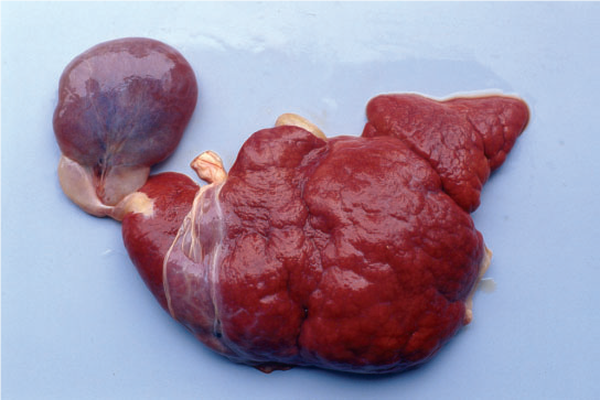 Superficie irregolare del fegato e presenza di una cisti epatica con contenuto di liquido rossastro in un vitello pancione (Testoni S. et. al. Congenital facial deformities, ascites and hepatic fibrosis in Romagnola calves. Vet Rec. 2009 May 30;164(22):693-4)