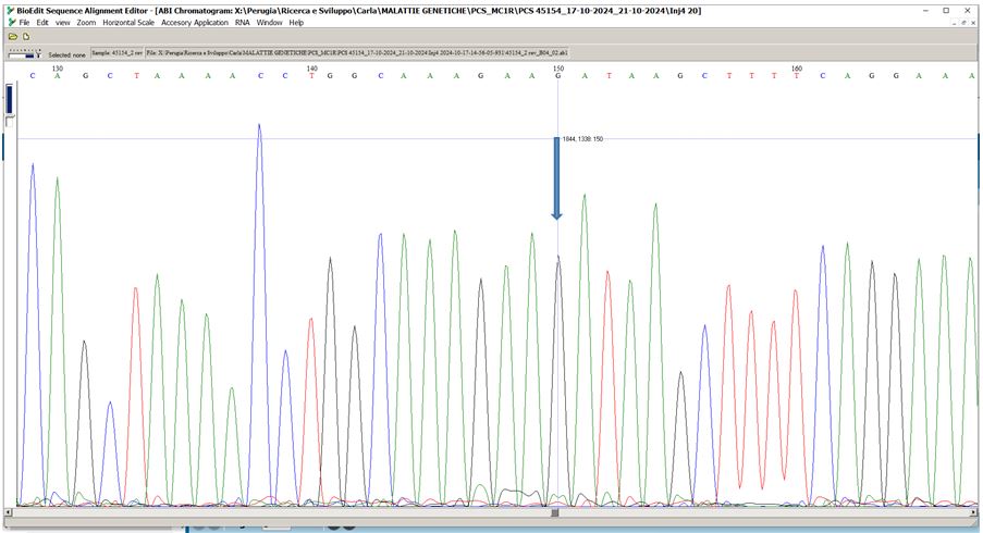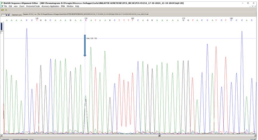 Profilo elettroforetico di un animale eterozigote, portatore della mutazione, responsabile della sindrome del vitello pancione. E’ evidente che nella posizione indicata dalla freccia, il sequenziatore identifica una R cioè una Adenina sull’allele mutato è una Guanina sull’allele sano.