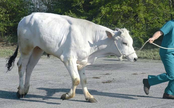 Bovino di razza chianina di 14 mesi che mostra un caratteristico andamento saltellante (immagine estratta dalla presentazione "Patologia neuromuscolare del bovino", di Orlando Paciello DVM, PhD del Dipartimento di Patologia e Sanità animale Università degli Studi di Napoli Federico II, paciello@unina.it, presentata nell'ambito delle Giornate di patologia veterinaria in memoria del prof. Gian Carlo Cravero: patologia neuro-muscolare e ispezione delle carni)