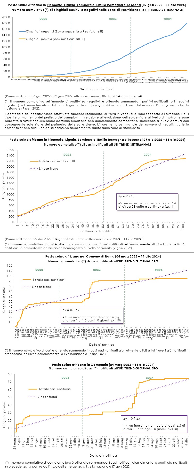 La malattia è stata notificata nel cinghiale per la prima volta in Toscana, comune di Zeri, provincia di Massa Carrara, in data 19 luglio 2024. In Emilia Romagna, il primo caso di malattia nel selvatico è stato confermato in data 09 novembre 2023, in provincia di Piacenza, comune di Ottone. In Lombardia la malattia è stata notificata nel selvatico in data 20 Giugno 2023, nel comune di Bagnaria, provincia di Pavia, mentre il primo caso nel domestico è stato confermato nel comune di Montebello della Battaglia, provincia di Pavia, il 18 agosto 2023. In Campania, in provincia di Salerno, in data 22 maggio 2023 sono stati confermati i primi casi di PSA nel cinghiale. In Calabria, in data 05 Maggio 2023 la presenza della malattia è stata confermata nella popolazione selvatica nel comune di Reggio Calabria (RC), mentre il primo allevamento infetto è stato confermato nel comune di Africo (RC) il 10 maggio. Precedentemente, in data 04 Maggio 2022 un caso di PSA era stato confermato in un cinghiale rinvenuto morto nel Parco dell’Insugherata (Comune di Roma) e il 07 Gennaio 2022 era stato confermato il primo caso di PSA in Italia continentale (comune di Ovada - AL). Come da disposizioni vigenti, sono state prontamente disposte le misure di emergenza e di controllo della diffusione dell’infezione, riportate nella sezione sottostante.