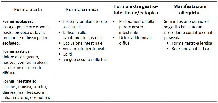La sintomatologia dell’anisakiasi si differenzia a seconda che si tratti di forma acuta, cronica o extra gastro-intestinale/ectopica.