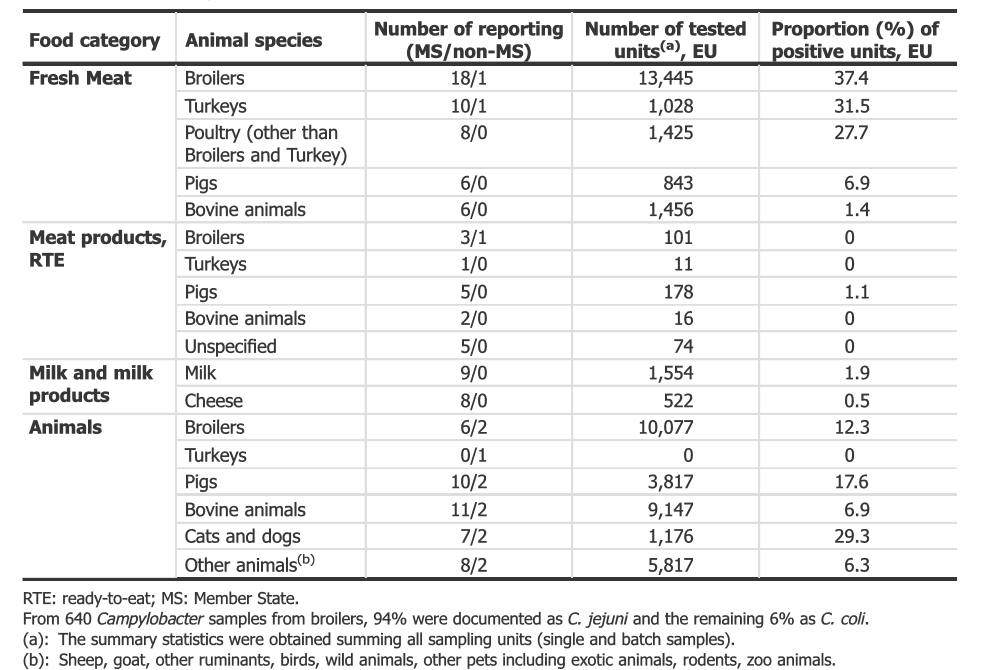 Nel 2017, la campylobacteriosi è stata la patologia gastrointestinale più frequentemente riferita nell’Unione Europea. Il Report EFSA (2018) segnala 246.158 casi confermati di campylobacteriosi nell’uomo, con un tasso di notifica di 64,8 casi/100.000 abitanti. Nel periodo 2008-2017 il numero di casi di campylobacteriosi è rimasto pressochè invariato. Sebbene la sua frequenza sia elevata, il tasso di mortalità risulta molto basso (0.04%), rappresentando comunque la terza causa di morte tra le zoonosi alimentari. La campylobacteriosi è una patologia soggetta a notifica obbligatoria nella gran parte dell’Unione Europea, ad eccezione di sei Stati tra cui l’Italia, dove la notifica si basa su sistemi di tipo volontario. Ciò determina un importante problema di sottonotifica di tale patologia. La principale fonte di infezione è rappresentata dalla carne di pollo (37.4% di positività), tacchino (31.5%), suino (6.9%) e bovino (1.4%).