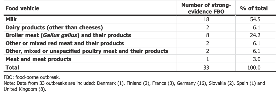 Suddivisione, per veicolo alimentare, dei focolai epidemici di campylobacteriosi