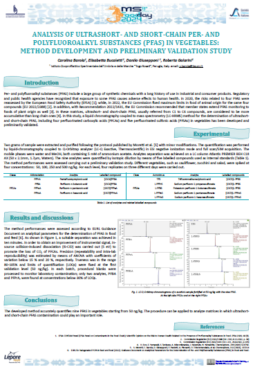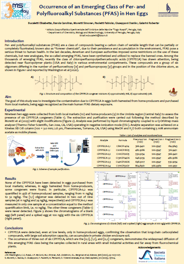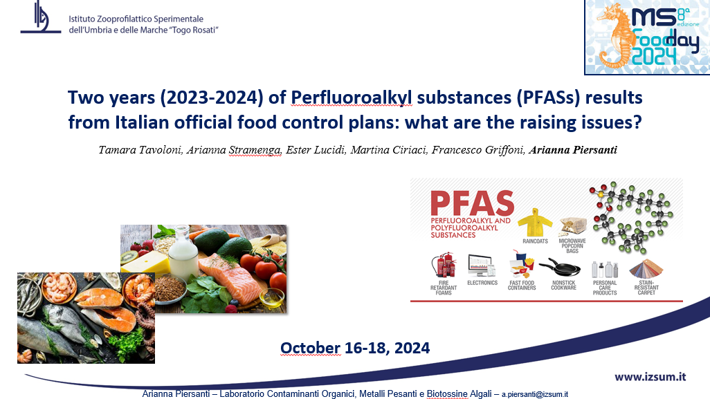 La Comunicazione Orale, dal titolo “Two years (2023-2024) of Perfluoroalkyl substances (PFASs) results from Italian official food control plans: what are the raising issues?”, è stata presentata dalla Dott.ssa Piersanti. Nell’ambito della comunicazione sono stati presentati i risultati relativi al monitoraggio dei livelli di contaminazione da Sostanze Per- e Polifluoroalchiliche (PFAS) in 223 campioni di alimenti di differente tipologia, prelevati nell’ambito dei piani di controllo ufficiale del biennio 2023-2024.