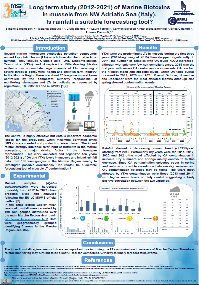 Nel poster dal titolo “Long term study (2012-2021) of Marine Biotoxins in mussels from NW Adriatic Sea (Italy). Is rainfall a suitable forecasting tool?” sono stati presentati i risultati di uno studio di correlazione tra i livelli di biotossine marine misurati tra il 2012 ed il 2021 nei mitili (Mytilus galloprovincialis) del medio Adriatico, ed i dati delle precipitazioni registrati nello stesso periodo dai pluviometri distribuiti nell’entroterra marchigiano.