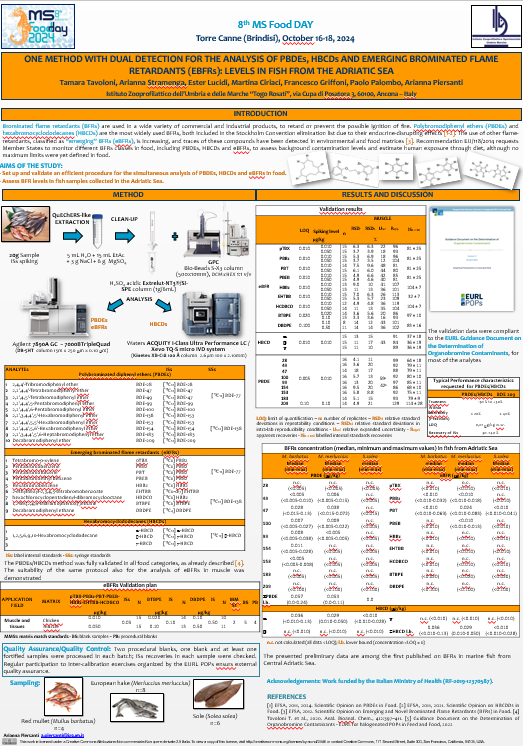 Nel poster dal titolo “One method with dual detection for the analysis of PBDEs, HBCDs and eBFRs: levels in fish from the Adriatic Sea” è stato presentato lo sviluppo e validazione di un metodo per l’analisi di tre classi di ritardanti di fiamma bromurati (BFR) negli alimenti, i Polibromobifenileteri (PBDE), gli Esabromociclododecani (HBCD) ed i Ritardanti di Fiamma Nuovi ed Emergenti (eBFR). I BFR sono sostanze chimiche di sintesi utilizzate in un'ampia varietà di prodotti commerciali ed industriali, per ritardare o prevenire l’infiammabilità. I PBDE e gli HBCD, a causa delle loro caratteristiche di persistenza e tossicità, sono stati inclusi nell'elenco di sostanze da eliminare della Convenzione di Stoccolma. Gli eBFR hanno nel tempo sostituito le altre classi di ritardanti di fiamma la cui produzione è stata vietata. Nel lavoro sono stati inoltre presentati i risultati di un monitoraggio effettuato su tre specie di pesci tra le più diffuse e consumate nel medio Adriatico: il merluzzo (Merluccius merluccius), la sogliola (Solea solea) e la triglia (Mullus barbatus).