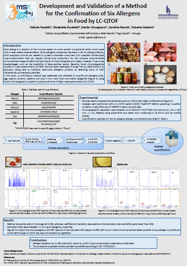 Infine, il Centro Specialistico Sviluppo Metodi Analitici che si occupa di mettere a punto e convalidare metodi chimici innovativi per l’analisi di residui negli alimenti, ha presentato tre poster, due dei quali riguardanti le succitate sostanze per- e polifluoroalchiliche (PFAS). I due contributi vertevano sull’analisi dei cosiddetti PFAS emergenti: “Analysis of Ultrashort- and Short-Chain Per- and Polyfluoroalkyl Substances (PFAS) in vegetables: method development and preliminary validation study” e “Occurrence of an Emerging Class of Per- and Polyfluoroalkyl Substances (PFAS) in Hen Egg”. Infatti, oltre ad effettuare le analisi ufficiali degli alimenti, l’Istituto Zooprofilattico Sperimentale dell’Umbria e delle Marche ha al suo interno anche una Struttura di Ricerca e Sviluppo creata per affrontare tempestivamente temi di emergente interesse nell’ambito della salute pubblica. Il terzo poster del Centro descrive un metodo analitico per determinare sei allergeni (latte, uova, soia, arachidi, mandorle e nocciole) in vari alimenti quali prodotti da forno, conserve vegetali, farine, preparazioni di carne e prodotti a base di carne mediante la cromatografia-liquida interfacciata alla spettrometria di massa: “Development and Validation of a Method for the Confirmation of Six Allergens in Food by LC-QTOF”. La procedura è stata recentemente accreditata ed è stata sviluppata per contrastare il fenomeno delle contaminazioni involontarie (cross-contamination) da allergeni per salvaguardare la popolazione sensibile a questi ingredienti anche se presenti in tracce.