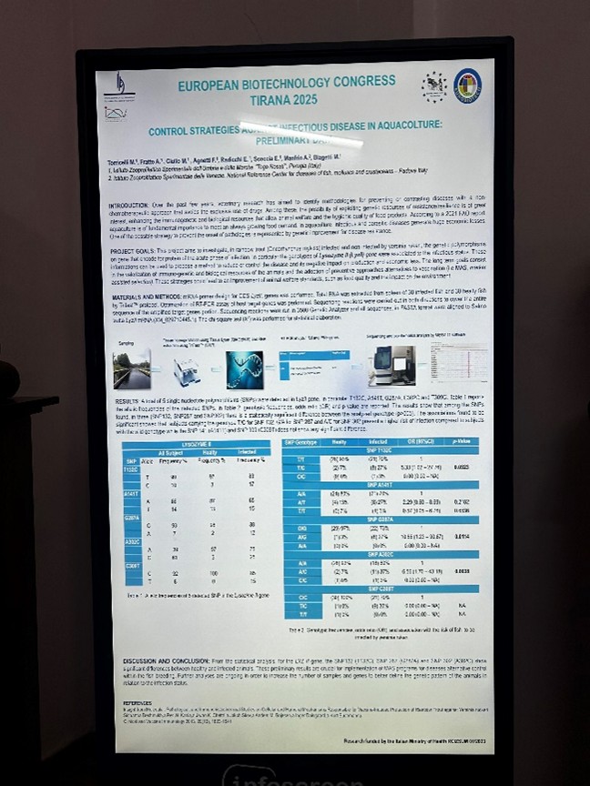 Il secondo contributo, “Control strategies against infectiuos disease in aquacolture: preliminary data”, riguardante studi di resistenza genetica verso patologie tipiche dell’acquacoltura, è stato presentato in collaborazione con il Centro di Referenza Nazionale per lo studio e la diagnosi delle malattie dei pesci, molluschi e crostacei presso l’IZS delle Venezie. In particolare, lo studio ha messo in evidenza cinque polimorfismi (SNPs) nel gene Lysozime II che differenziano significativamente l’aplotipo associato al fenotipo sano e l’aplotipo associato al fenotipo malato. Il progetto è finanziato dal Ministero della Salute Italiano nell’ambito della ricerca corrente IZSUM 001/2023 RC.