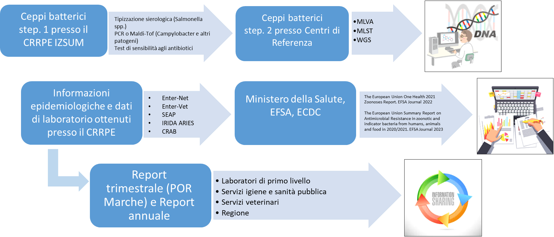- Centri di Referenza Nazionali: raccolgono ed elaborano le informazioni ricevute dai Laboratori Regionali di Riferimento e provvedono ad eseguire ulteriori analisi di caratterizzazione genomica sugli isolati ricevuti (MLVA, MLST, WGS); alimentano a loro volta flussi dati verso piattaforme nazionali ed internazionali (ECDC ed EFSA)