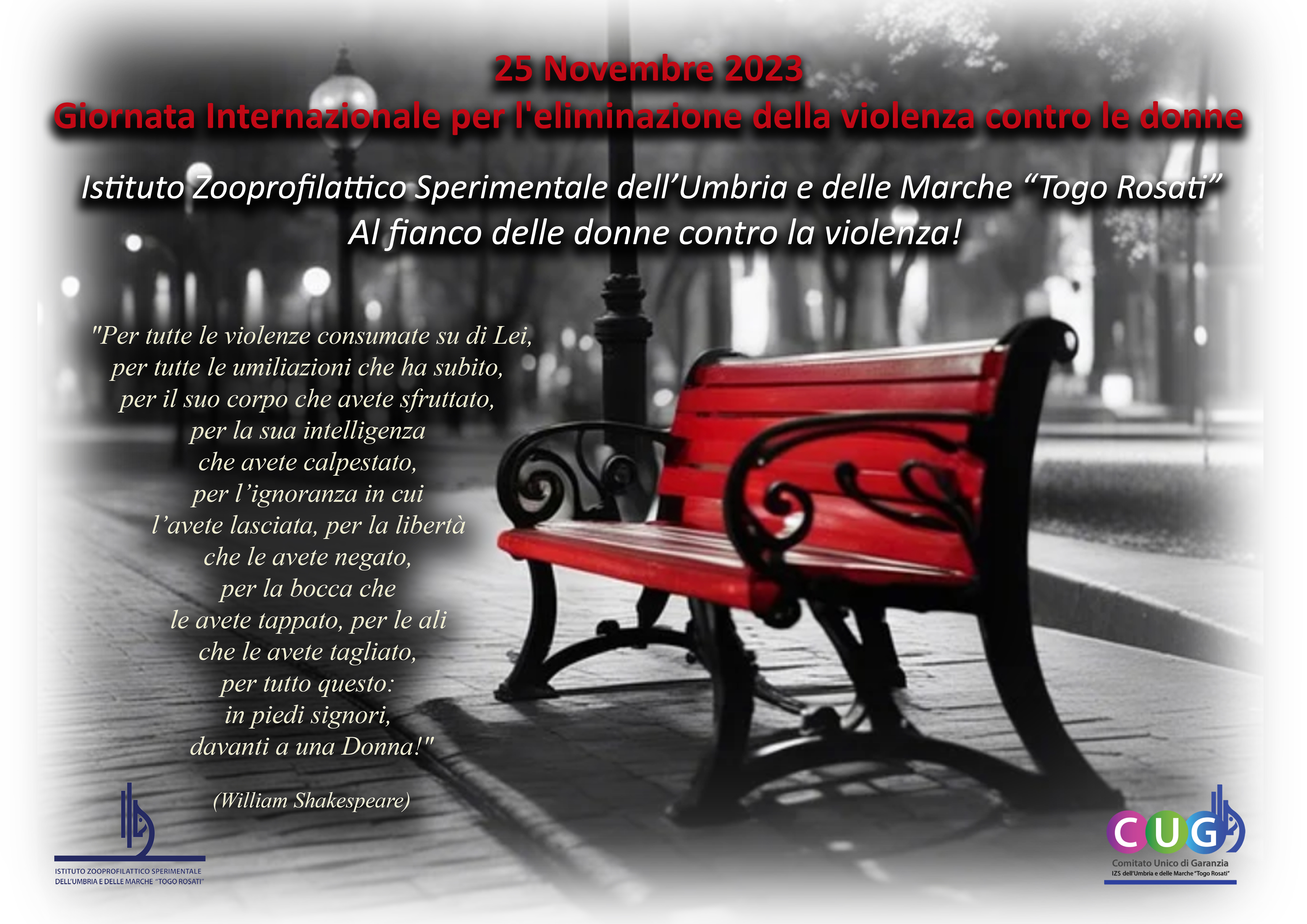 Il Comitato Unico di Garanzia (CUG) dell’Istituto Zooprofilattico Sperimentale dell’Umbria e delle Marche “Togo Rosati”, in occasione della Giornata Internazionale per l’eliminazione della violenza contro le donne, richiama l’attenzione di colleghe e colleghi, con un’immagine diffusa, attraverso il sito istituzionale e affissa in ogni sede, sul tema della violenza contro le donne con la convinzione che la sensibilizzazione accresca la consapevolezza.